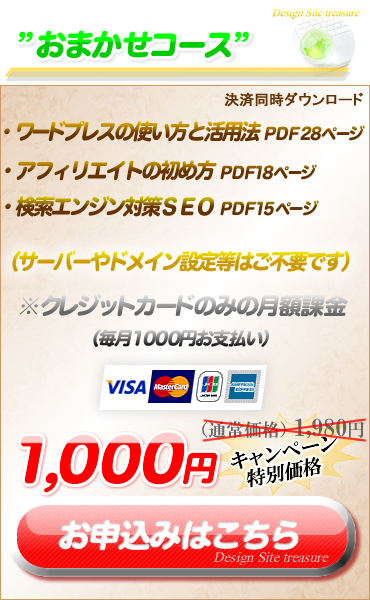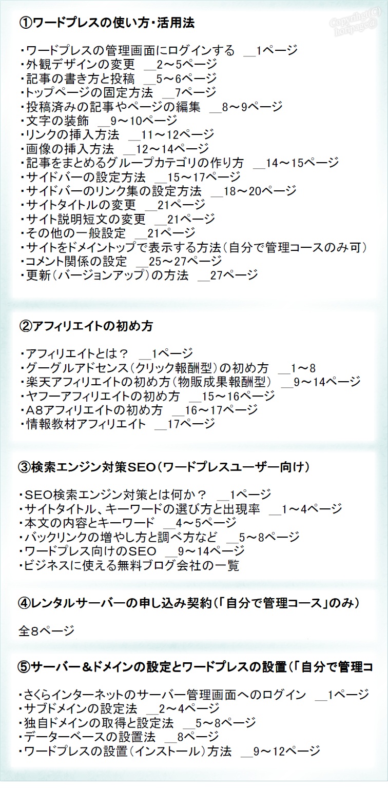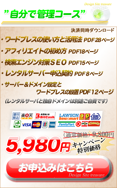 | 初期費用 | ・本マニュアル&特典一式5,980円 ・さくらサーバーの初期費用1,000円 |