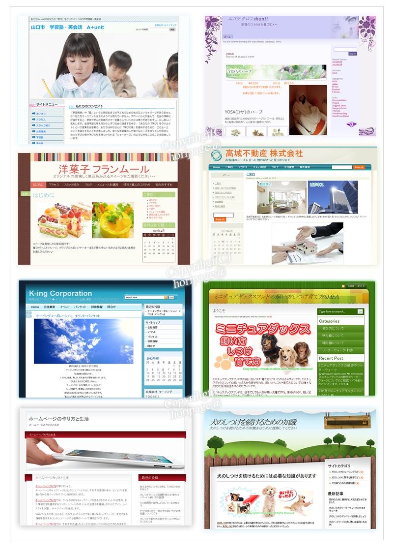 他にも、実際にワードプレスのデザインを使って作られたホームページやブログをご覧になってみてください。いくつかのジャンルを掲載いたしましたので、あなたが作りたいサイトのイメージもわいてくることでしょう。