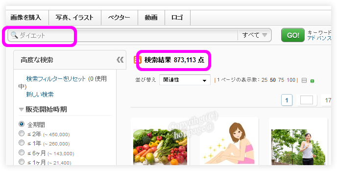 写真点数は膨大にあります。例えば、下図のように「ダイエット」と検索して候補が上がる写真点数は、なんと873,113枚もあるんです。