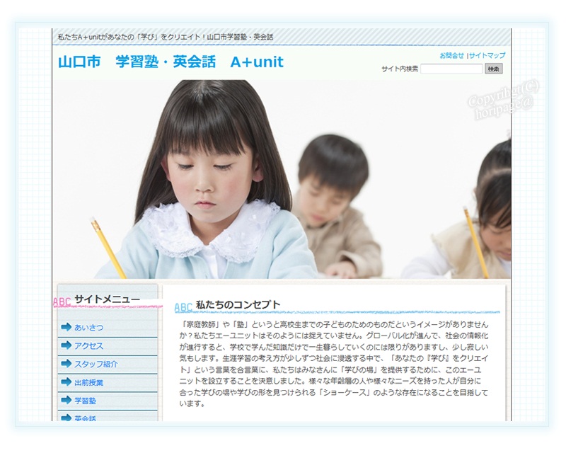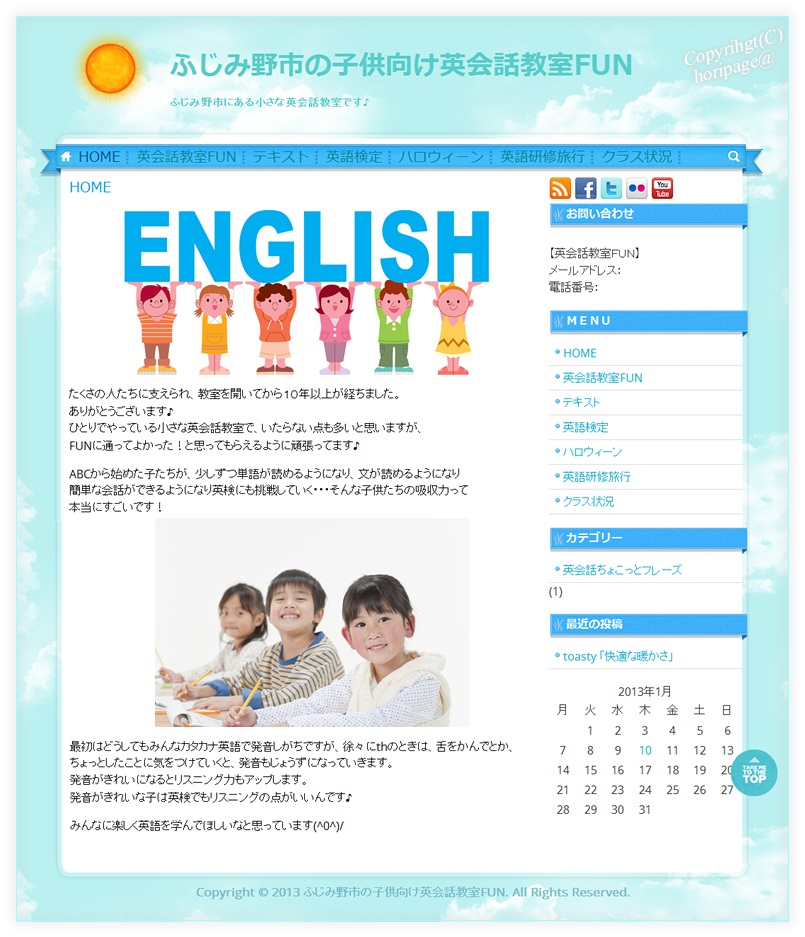 ↓ちなみに下のサイトは、実際にお客様からご依頼をいただき「デザインチケット」でお作りしたサイトです。子供向けの英会話教室ということで、明るく楽しい雰囲気のイメージでお作りいたしました↓