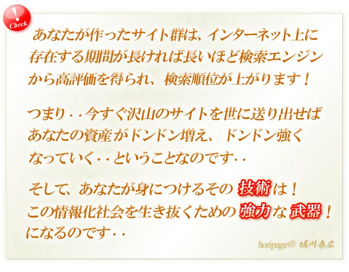 成功者達は、今この瞬間もホームページやブログを作り続けています。あなたも早くご自分のホームページやブログを作り資産を積み上げる必要があります。